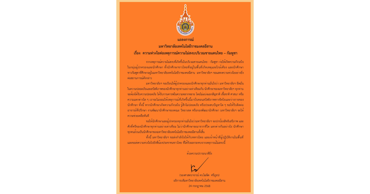 ข่าวประชาสัมพันธ์ มหาวิทยาลัยเทคโนโลยีราชมงคลอีสาน แสดงความห่วงใยต่อเหตุการณ์ความไม่สงบที่เกิดขึ้นในพื้นที่ชายแดนไทย – กัมพูชา มหาวิทยาลั...อ่านเพิ่มเติม กรกฎาคม 26, 2025ข่าวประชาสัมพันธ์