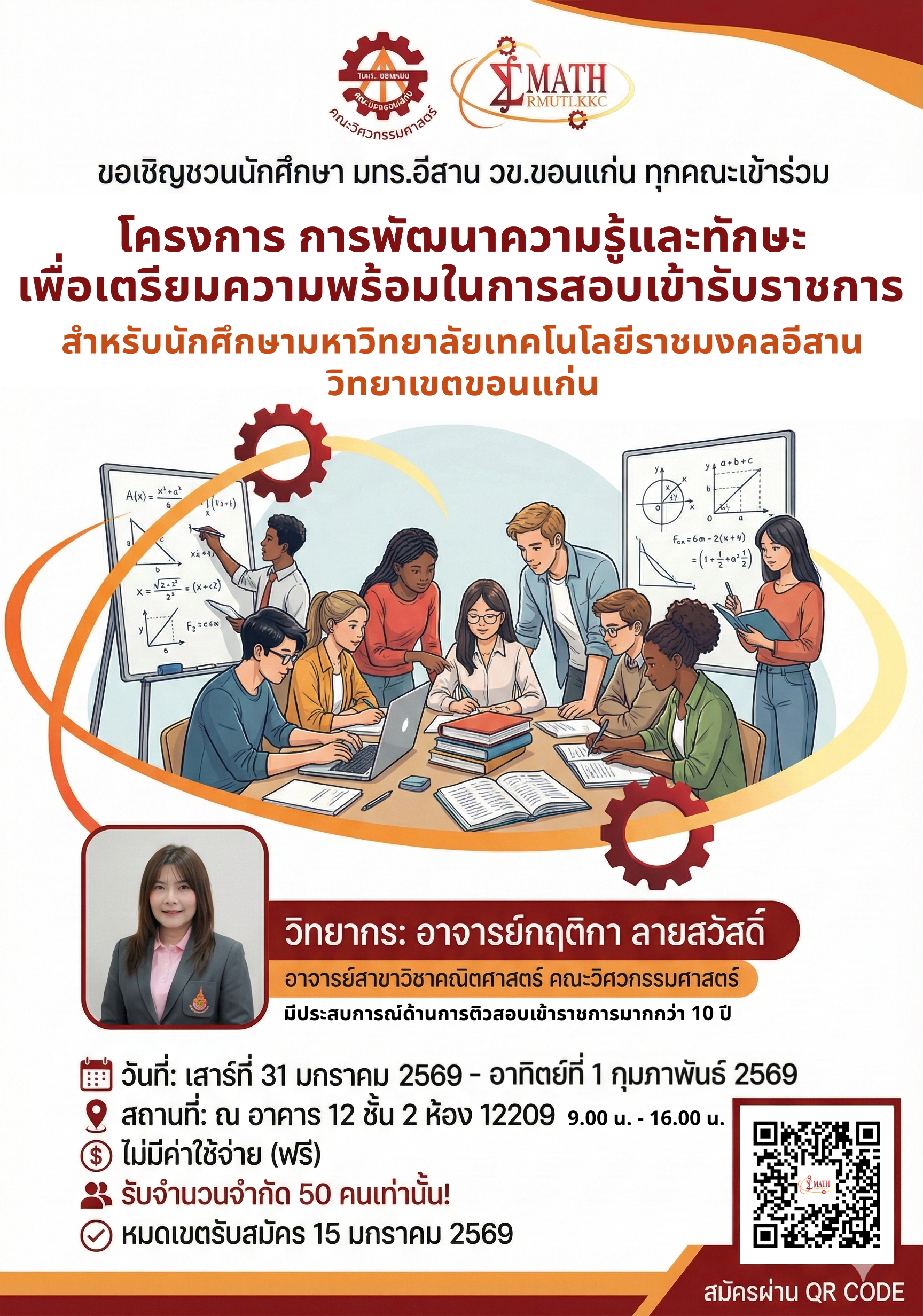 ข่าวประชาสัมพันธ์ ขอเชิญชวนนักศึกษามทร.อีสาน วข.ขอนแก่น ทุกคณะ เข้าร่วม โครงการพัฒนาความรู้และทักษะเพื่อเตรียมความพร้อมในการสอบเข้ารับราชการ 🗓️ สาขาวิชาคณ...อ่านเพิ่มเติม ธันวาคม 21, 2025ข่าวประชาสัมพันธ์