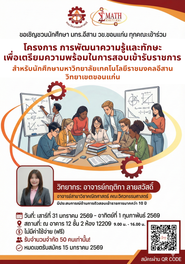 สาขาวิชาคณิตศาสตร์ คณะวิศวกรรมศาสตร์ มหาวิทยาลัยเทคโนโลยีราชมงคลอีสาน วิทยาเขตขอนแก่น ขอเชิญชวนนักศึกษาทุกคณะ ทุกชั้นปี เข้าร่วม โครงการ “การพัฒนาความรู้และทักษะเพื่อเตรียมความพร้อมในการสอบเข้ารับราชการ” เพื่อเสริมความรู้และทักษะที่จำเป็นสำหรับการเตรียมตัวสอบเข้ารับราชการอย่างเป็นระบบ
