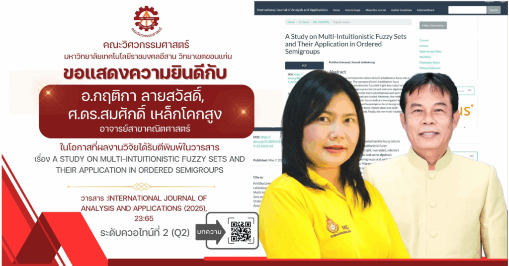 - อาจารย์กฤติกา ลายสวัสดิ์ และ รศ. ดร.สมศักดิ์ เหล็กโคกสูง ได้รับตีพิมพ์ เรื่อง A study on multi-intuitionistic fuzzy sets and their application in ordered semigroups วารสาร International Journal of Analysis and Applications ระดับควอไทล์ที่ 2 (Q2) ลิงค์บทความ [https://doi.org/10.28924/2291-8639-23-2025-63]