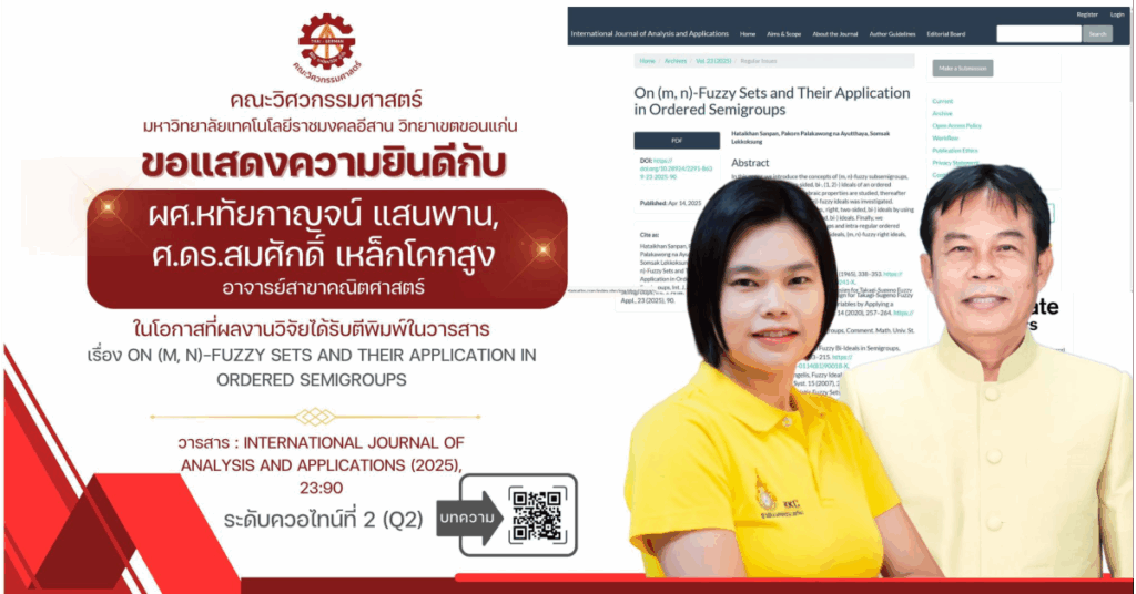 - ผศ.หทัยกาญจน์ แสนพาน และ รศ. ดร.สมศักดิ์ เหล็กโคกสูง ได้รับตีพิมพ์ เรื่อง On (m, n)-fuzzy sets and their application in ordered semigroups วารสาร International Journal of Analysis and Applications ระดับควอไทล์ที่ 2 (Q2) ลิงค์บทความ [https://doi.org/10.28924/2291-8639-23-2025-90]